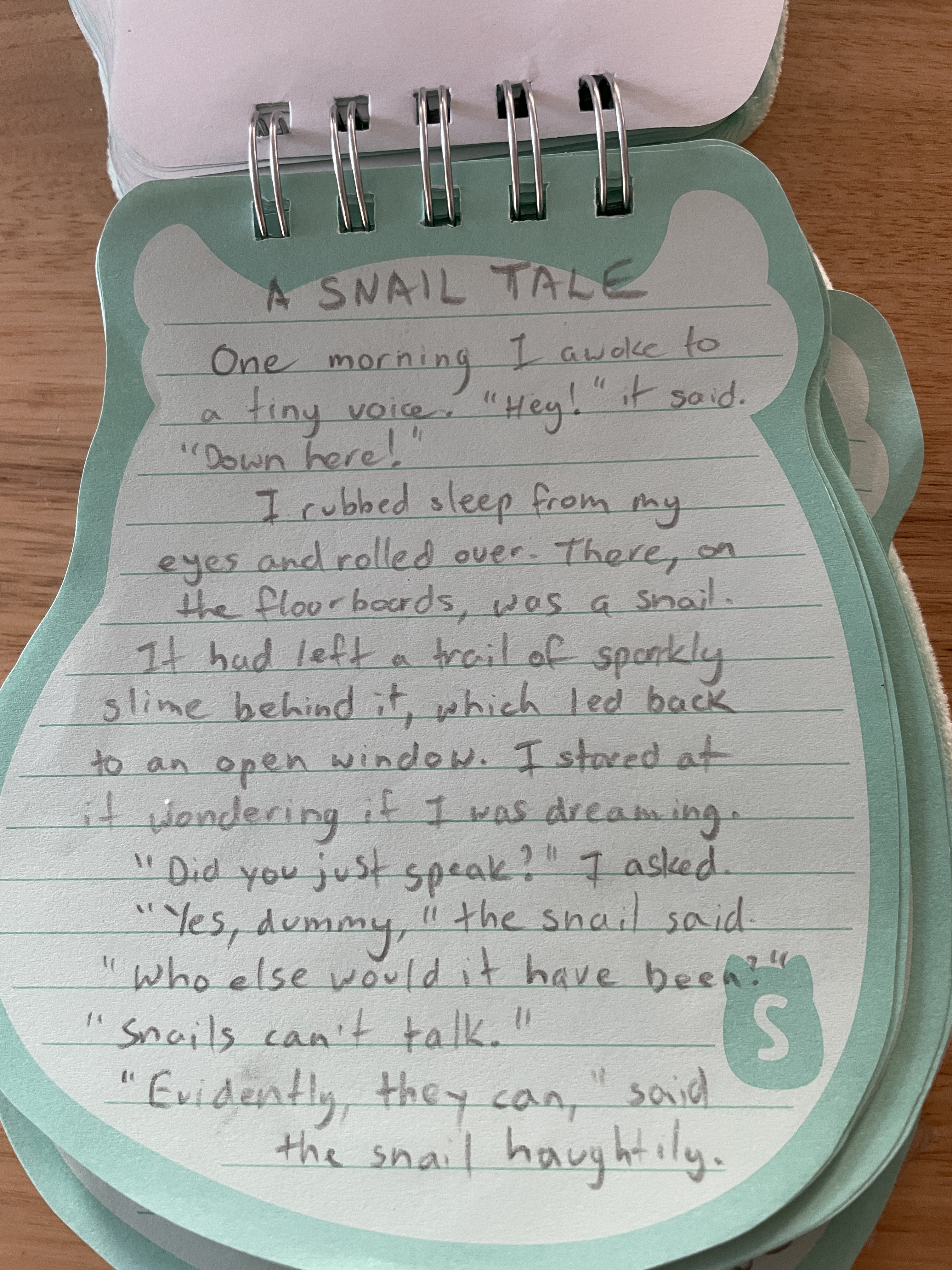 I seldom write flash fiction, but that’s what ‘A Snail Tale’ is. I wrote it on a whim, longhand, to amuse my children during a dull night out. When I say ‘longhand’, I mean in the little owl notepad my son brought along. If I recall, it was his request that I write a story about a snail.