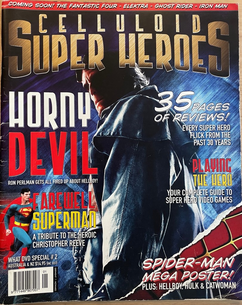 If someone were to pick up a copy of Celluloid Superheroes today, he or she would tally my contributions (an editor’s column, a handful of reviews and a few other items) and justifiably assume I had little creative input. But the title originated in my head. So did the parameters and scope (a review of every superhero movie made in the past 30 years plus supporting features and interviews). So did the rating system (separate evaluations on each movie as a standalone feature and as an adaptation of the source material). So did the last-minute decision to include an obituary on the recently deceased Christopher Reeve. So did the choice of cover image (Hellboy). So did the concept of including A2 comic book movie posters in the centre. And so on.